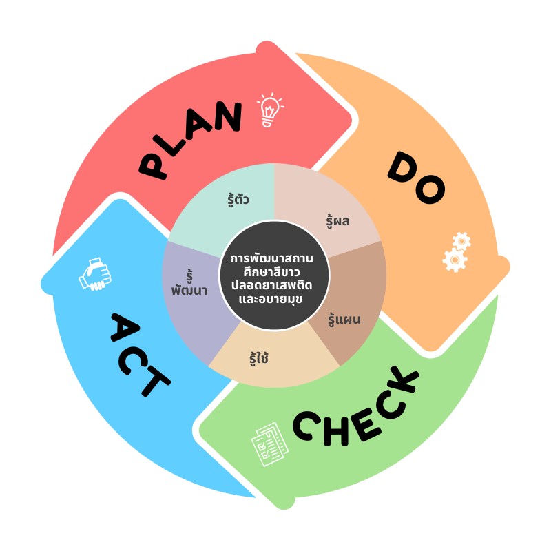 การพัฒนาสถานศึกษาสีขาว ปลอดยาเสพติดและอบายมุข โดยกลยุทธ์ 5 รู้ มีการดำเนินการตามหลักการและแนวคิด โดยศึกษาแนวคิดทฤษฎีต่าง ๆ ในการออกแบบและพัฒนาสถานศึกษา มีการบูรณาการหลักสูตรสถานศึกษา แผนปฏิบัติการของสถานศึกษารวมทั้งโครงการกิจกรรมต่าง ๆ อย่างสอดคล้องเชื่อมโยงกัน รวมทั้งมีการประชุมครูและบุคลากร คณะกรรมการสถานศึกษา ตลอดจนภาคีเครือข่ายเพื่อให้ทุกฝ่ายมีส่วนร่วมในการพัฒนาสถานศึกษา จากนั้นนำข้อมูลมาเป็นส่วนหนึ่งในการพัฒนาออกแบบนวัตกรรมตามหลักการแนวคิดการออกแบบนวัตกรรม สู่การนำนวัตกรรมมาใช้ขับเคลื่อนสถานศึกษาสู่การปฏิบัติอย่างยั่งยืน โครงสร้าง