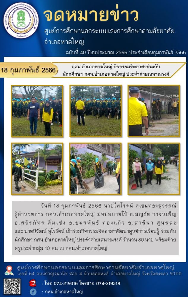 กศน.อำเภอหาดใหญ่ กิจกรรมจิตอาสาร่วมกับ นักกศึกษา กศน.อำเภอหาดใหญ่ ประจำค่ายเสนาณรงค์