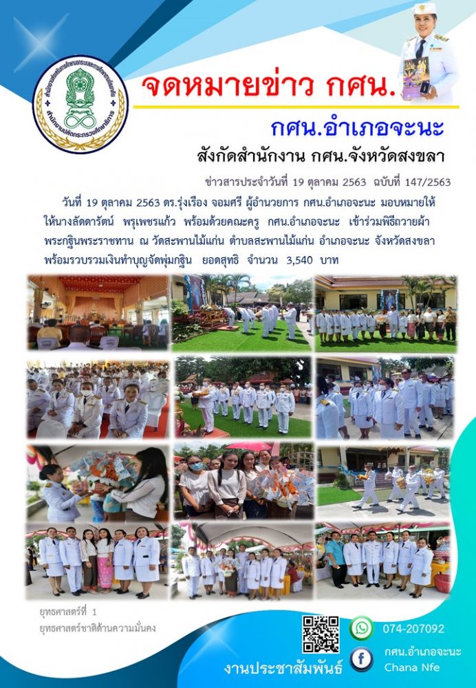 วันที่ 19 ตุลาคม 2563 ดร.รุ่งเรือง จอมศรี ผู้อำนวยการ กศน.อำเภอจะนะ มอบหมายให้ให้นางลัดดารัตน์ พรุเพชรแก้ว พร้อมด้วยคณะครู กศน.อำเภอจะนะ เข้าร่วมพิธีถวายผ้าพระกฐินพระราชทาน ณ วัดสะพานไม้แก่น ตำบลสะพานไม้แก่น อำเภอจะนะ จังหวัดสงขลา พร้อมรวบรวมเงินทำบุญจัดพุ่มกฐิน ยอดสุทธิ จำนวน 3,540 บาท