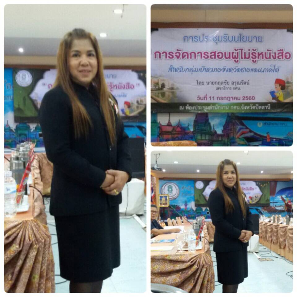 วันที่ 11 กรกฎาคม 2560 นางรุ่งเรือง จอมศรี ผอ กศน.อำเภอจะนะ เข้าร่วมประชุมรับนโยบายการจัดการสอนผู้ไม่รู้หนังสือ สำหรับกลุ่มเป้าหมายผู้ไม่รู้หนังสือในจังหวัดชายแดนภาคใต้ โดย ท่านกฤตชัย อรุณรัตน์ เลขาธิการ กศน. ณ ห้องประชุม สำนักงาน กศน.จังหวัดปัตตานี