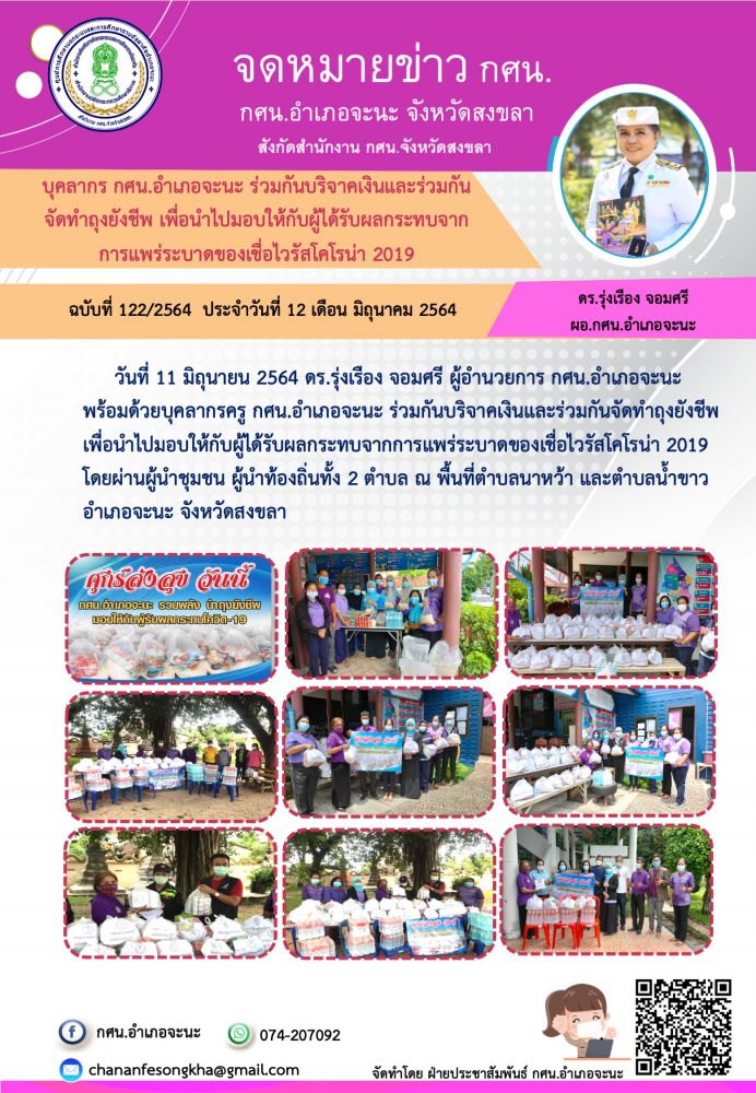 วันที่ 11 มิถุนายน 2564 ดร.รุ่งเรือง จอมศรี ผู้อำนวยการ กศน.อำเภอจะนะ พร้อมด้วยบุคลากรครู กศน.อำเภอจะนะ ร่วมกันบริจาคเงินและร่วมกันจัดทำถุงยังชีพ เพื่อนำไปมอบให้กับผู้ได้รับผลกระทบจากการแพร่ระบาดของเชื่อไวรัสโคโรน่า 2019 โดยผ่านผู้นำชุมชน ผู้นำท้องถิ่นทั้ง 2 ตำบล ณ พื้นที่ตำบลนาหว้า และตำบลน้ำขาว อำเภอจะนะ จังหวัดสงขลา