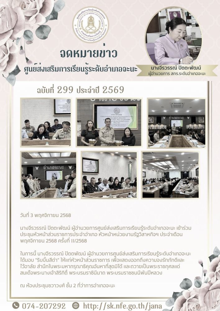 วันที่ 3 พฤศจิกายน 2568 นางจีรวรรณ์ ปัตตะพัฒน์ ผู้อำนวยการศูนย์ส่งเสริมการเรียนรู้ระดับอำเภอจะนะ เข้าร่วมประชุมหัวหน้าส่วนราชการประจำอำเภอ หัวหน้าหน่วยงานรัฐวิสาหกิจฯ ประจำเดือนพฤศจิกายน 2568 ครั้งที่ 11/2568 ในการนี้ นางจีรวรรณ์ ปัตตะพัฒน์ ผู้อำนวยการศูนย์ส่งเสริมการเรียนรู้ระดับอำเภอจะนะ ได้มอบ "ริบบิ้นสีดำ" ให้แก่หัวหน้าส่วนราชการ เพื่อแสดงออกถึงความจงรักภักดีและไว้อาลัย สำนึกในพระมหากรุณาธิคุณอันหาที่สุดมิได้ และถวายเป็นพระราชกุศลแด่สมเด็จพระนางเจ้าสิริกิติ์ พระบรมราชินีนาถ พระบรมราชชนนีพันปีหลวง ณ ห้องประชุมชวาวงศ์ ชั้น 2 ที่ว่าการอำเภอจะนะ