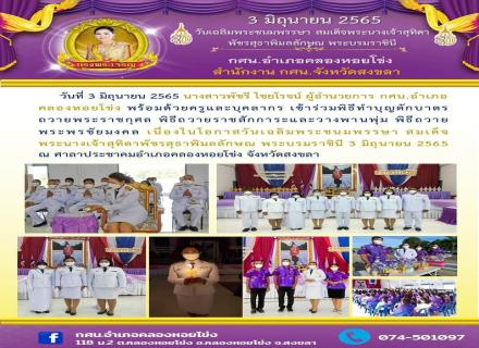 วันที่3 มิถุนายน 2565 นางสาวพัชรี ไชยโรจน์ ผู้อำนวยการ กศน.อำเภอคลองหอยโข่ง พร้อมด้วยครูและบุคลากร เข้าร่วมพิธีทำบุญตักบาตรถวายพระราชกุศล พิธีถวายราชสักการะและวางพานพุ่ม พิธีถวายพระพรชัยมงคล เนื่องในโอกาสวันเฉลิมพระชนมพรรษา สมเด็จพระนางเจ้าสุทิดา พัชรสุธ