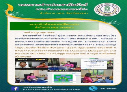 วันที่ 9 มิถุนายน 2565 นางสาวพัชรี ไชยโรจน์ ผู้อำนวยการ กศน.อำเภอคลองหอยโข่ง เข้ารับการอบรมนักบริหารการเปลี่ยนแปลง สำนักงาน กศน. Module 3 การอบรมเสริมสร้างทักษะด้านการปฏิบัติงาน (Professional Skills) และการสร้างเครือข่ายการทำงานร่วมกับภาคีเครือข่าย (Netw