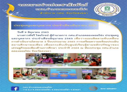 วันที่ 9 มิถุนายน 2565 นางสาวพัชรี ไชยโรจน์ ผู้อำนวยการ กศน.อำเภอคลองหอยโข่ง ประชุมครูและบุคลากรประจำเดือนมิถุนายน 2565 เพื่อวางแผนติดตามขับเคลื่อนการดำเนินงานไตรมาส 3 ปีงบประมาณ 2565 การเตรียมความพร้อมประเมินสถานศึกษาพอเพียง เพื่อยกระดับเป็นศูนย์เรียนรู้