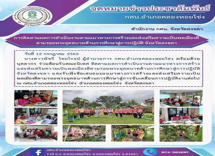 วันที่ 12 กรกฎาคม 2565 นางสาวพัชรี ไชยโรจน์ ผู้อำนวยการ กศน.อำเภอคลองหอยโข่ง พร้อมด้วยบุคลากร ร่วมต้อนรับคณะนิเทศ ติดตามผลการดำเนินงานตามแนวทางการสร้างและส่งเสริมความเป็นพลเมืองดีตามรอยพระยุคลบาทด้านการศึกษาสู่การปฎิบัติ จังหวัดสงขลา และรับฟังข้อเสนอแนะแ