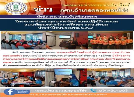 วันที่ 23-24 ธันวาคม 2564 นางสาวพัชรี ไชยโรจน์ ผู้อำนวยการ กศน.อำเภอ คลองหอยโข่ง มอบหมายให้ นางสาวอนุสรา ยาพระจันทร์ ตำแหน่ง ครูผู้ช่วย จัดโครงการพัฒนาบุคลากรจัดทำแผนปฏิบัติการและแผนพัฒนาการจัดการศึกษา กศน.ตำบล ประจำปีงบประมาณ 2565 ตามนโยบายและจุด