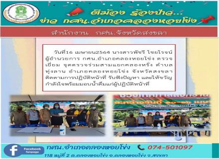 วันที่16 เมษายน2564 นางสาวพัชรี ไชยโรจน์ ผู้อำนวยการ กศน.อำเภอคลองหอยโข่ง ตรวจเยี่ยม จุดตรวจร่วมสามแยกคลองหรั่ง ตำบลทุ่งลาน อำเภอคลองหอยโข่ง จังหวัดสงขลา ติดตามการปฏิบัติหน้าที่ รับฟังปัญหา และให้ขวัญกำลังใจพร้อมมอบน้ำดื่มแก่ผู้ปฏิบัติหน้าที่