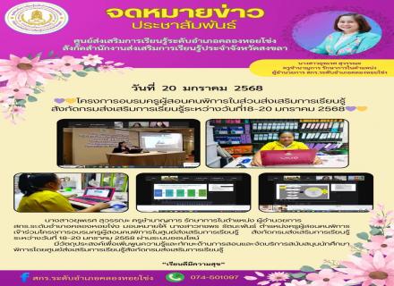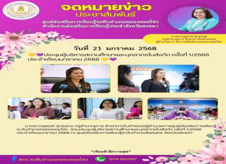 วันที่ 21 มกราคม 2568 นางสาวขนิษฐา มณีรัตน์ ผู้อำนวยสำนักงานส่งเสริมการเรียนรู้ประจำจังหวัดสงขลา มอบหมายให้คณะครู และบุคลากรของศูนย์ส่งเสริมการเรียนรู้ระดับอำเภอคลองหอยโข่ง ภายใต้ก