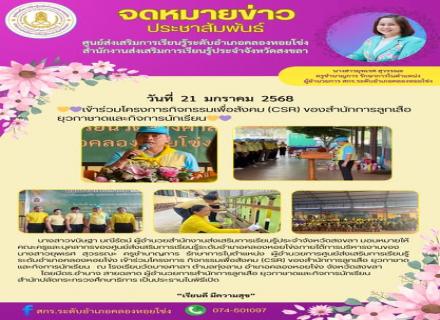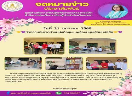 วันที่ 21 มกราคม 2568 นางสาวยุพเรศ สุวรรณะ ครูชำนาญการ รักษาการในตำแหน่งผู้อำนวยการศูนย์ส่งเสริมการเรียนรู้ระดับอำเภอคลองหอยโข่ง มอบหมายให้นางนูริซอ เอี่ยมใจรัก ตำแหน่ง ครู กศน.ตำบล นำนักศึกษาและอาสาสมัครส่งเสริมการอ่าน ศูนย์การเรียนรู้ระดับ