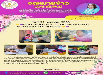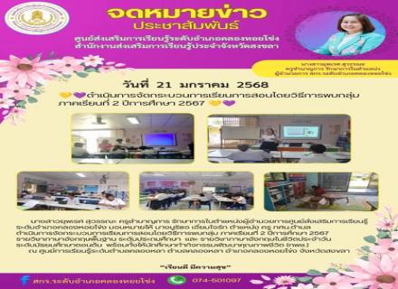 วันที่ 21 มกราคม 2568 นางสาวยุพเรศ สุวรรณะ ครูชำนาญการ รักษาการในตำแหน่งผู้อำนวยการศูนย์ส่งเสริมการเรียนรู้ระดับอำเภอคลองหอยโข่ง มอบหมายให้นางนูริซอ เอี่ยมใจรัก ตำแหน่ง ครู กศน.ตำบล ดำเนินการจัดกระบวนการเรียนการสอนโดยวิธีการพบกลุ่ม ภาคเรียนที่ 2 ปีการ