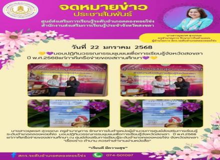 วันที่ 22 มกราคม 2568 นางสาวยุพเรศ สุวรรณะ ครูชำนาญการ รักษาการในตำแหน่งผู้อำนวยการศูนย์ส่งเสริมการเรียนรู้ระดับอำเภอคลองหอยโข่งมอบปฏิทินวรรณกรรมชุมชนเพื่อการเรียนรู้จังหวัดสงขลา ปี พ.ศ.2568 แก่ภาคีเครือข่ายของสถานศึกษา ณ ศูนย์ส่งเสริมการเรียนรู