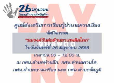 วันที่ 26 มิถุนายน ของทุกปี กำหนดให้เป็นวันต่อต้านยาเสพติดโลก ศูนย์ส่งเสริมการเรียนรู้อำเภอควนเนียง กำหนดจัดกิจกรรม รณรงค์ต่อต้านยาเสพติด ในวันที่ 26 มิถุนายน 2566 เวลา 09.00 - 12.00 น. ณ กศน.ตำบลบางเหรียง |