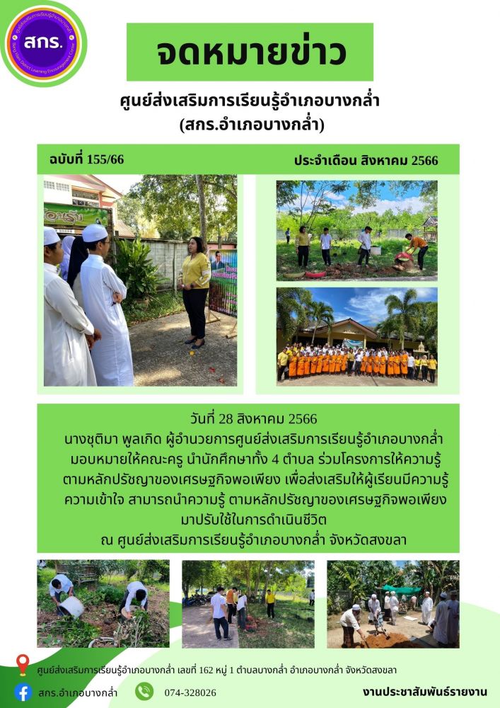 วันที่ 28 สิงหาคม 2566 โครงการให้ความรู้ตามหลักปรัชญาของเศรษฐกิจพอเพียง เพื่อส่งเสริมให้ผู้เรียนมีความรู้ ความเข้าใจ สามารถนำความรู้ ตามหลักปรัชญาของเศรษฐกิจพอเพียงมาปรับใช้ในการดำเนินชีวิต