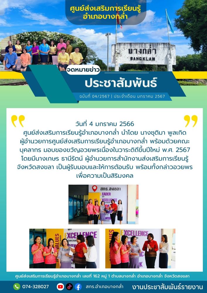 ข่าวประชาสัมพันธ์ วันที่ 4 มกราคม 2566 🎁 ศูนย์ส่งเสริมการเรียนรู้อำเภอบางกล่ำ นำโดย นางชุติมา พูลเกิด ผู้อำนวยการศูนย์ส่งเสริมการเรียนรู้อำเภอบางกล่ำ พร้อมด้วยคณะบุคลากร #มอบของขวัญอวยพรเนื่องในวาระดิถีขึ้นปีใหม่ พ.ศ. 2567 โดยมีนางเกษร ธานีรัตน์ ผู้อำนวยการสำนั