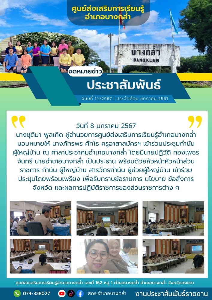 วันที่ 8 มกราคม 2567 นางชุติมา พูลเกิด ผู้อำนวยการศูนย์ส่งเสริมการเรียนรู้อำเภอบางกล่ำ มอบหมายให้ นางภัทรพร ศัทโธ ครูอาสาสมัครฯ เข้าร่วมประชุมกำนัน ผู้ใหญ่บ้าน ณ ศาลาประชาคมอำเภอบางกล่ำ