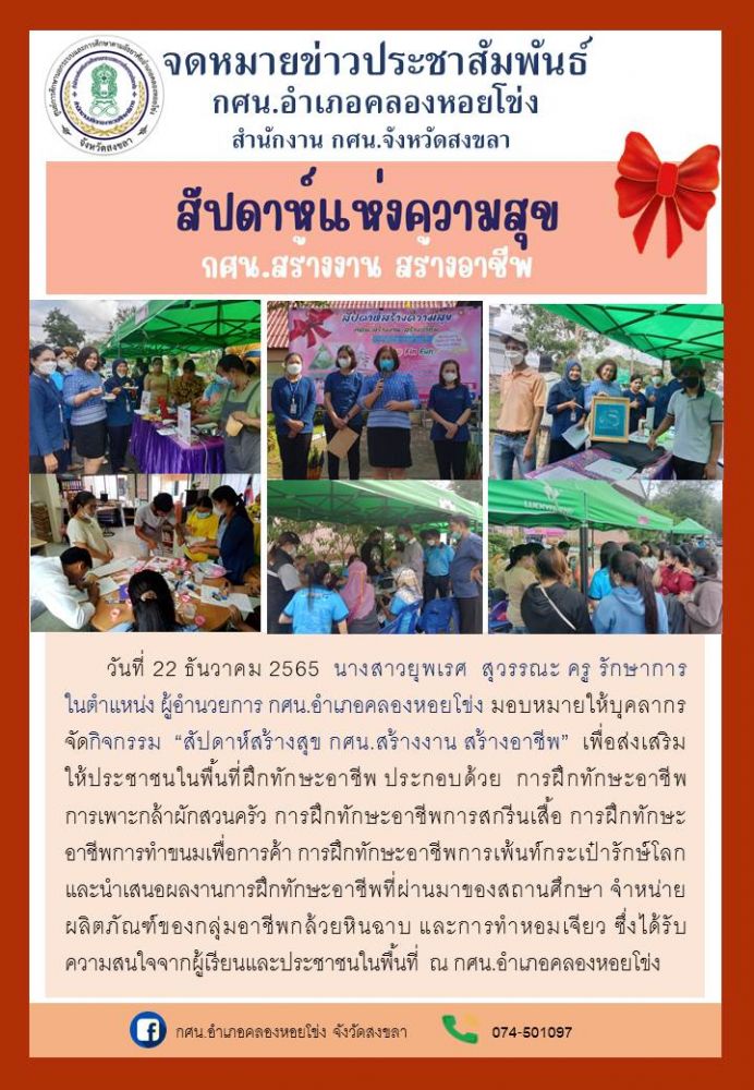 มอบหมายให้บุคลากร จัดกิจกรรม “สัปดาห์สร้างสุข กศน.สร้างงาน สร้างอาชีพ” เพื่อส่งเสริมให้ประชาชนในพื้นที่ฝึกทักษะอาชีพ
