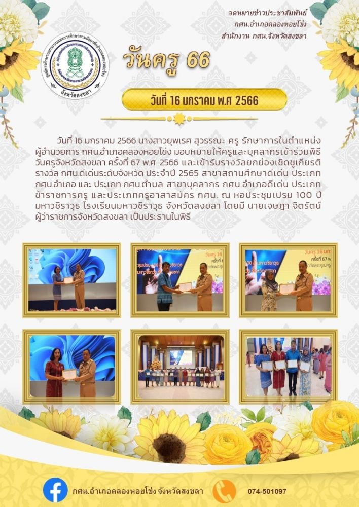 มอบหมายให้ครูและบุคลากรเข้าร่วมพิธีวันครูจังหวัดสงขลา  ครั้งที่ 67 พ.ศ. 2566 และเข้ารับรางวัลยกย่องเชิดชูเกียรติ รางวัล กศน.ดีเด่นระดับจังหวัด ประจำปี 2565