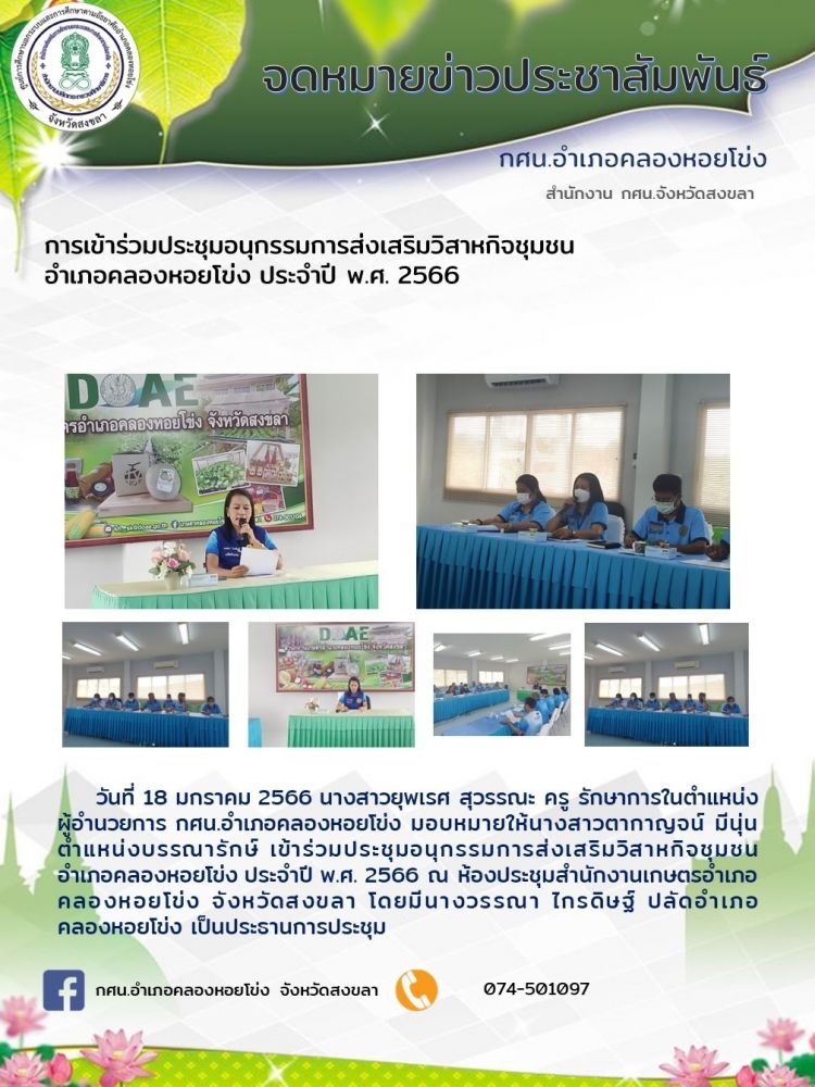 มอบหมายให้นางสาวตากาญจน์ มีนุ่น ตำแหน่งบรรณารักษ์ เข้าร่วมประชุมอนุกรรมการส่งเสริมวิสาหกิจชุมชนอำเภอคลองหอยโข่ง ประจำปี พ.ศ.2566