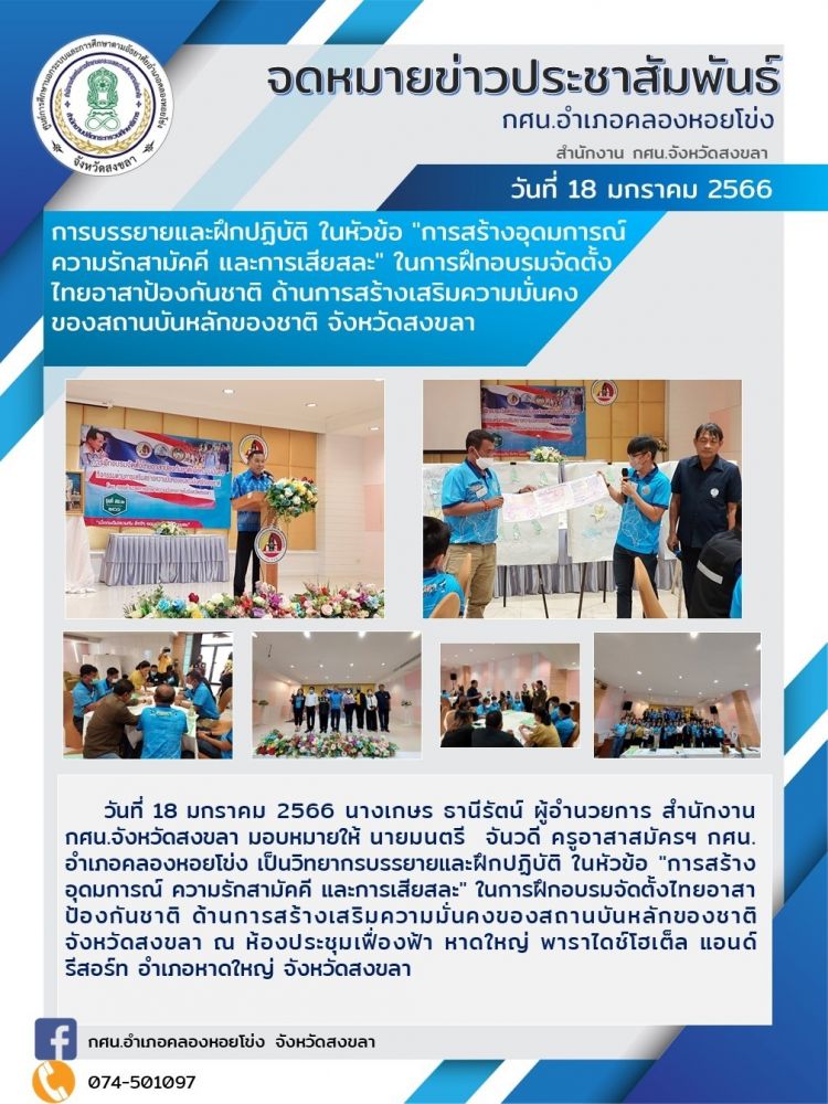 บุคลากร กศน.อำเภอคลองหอยโข่ง เป็นวิทยากรบรรยายและฝึกปฏิบัติ ในหัวข้อ \"การสร้างอุดมการณ์ ความรักสามัคคี และการเสียสละ\" ในการฝึกอบรมจัดตั้งไทยอาสาป้องกันชาติ ด้านการสร้างเสริมความมั่นคงของสถานบันหลักของชาติ จังหวัดสงขลา