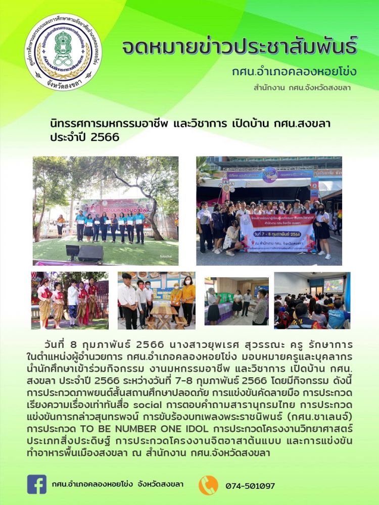 มอบหมายครูและบุคลากร นำนักศึกษาเข้าร่วมกิจกรรม งานมหกรรมอาชีพ และวิชาการ เปิดบ้าน กศน.สงขลา ประจำปี 2566