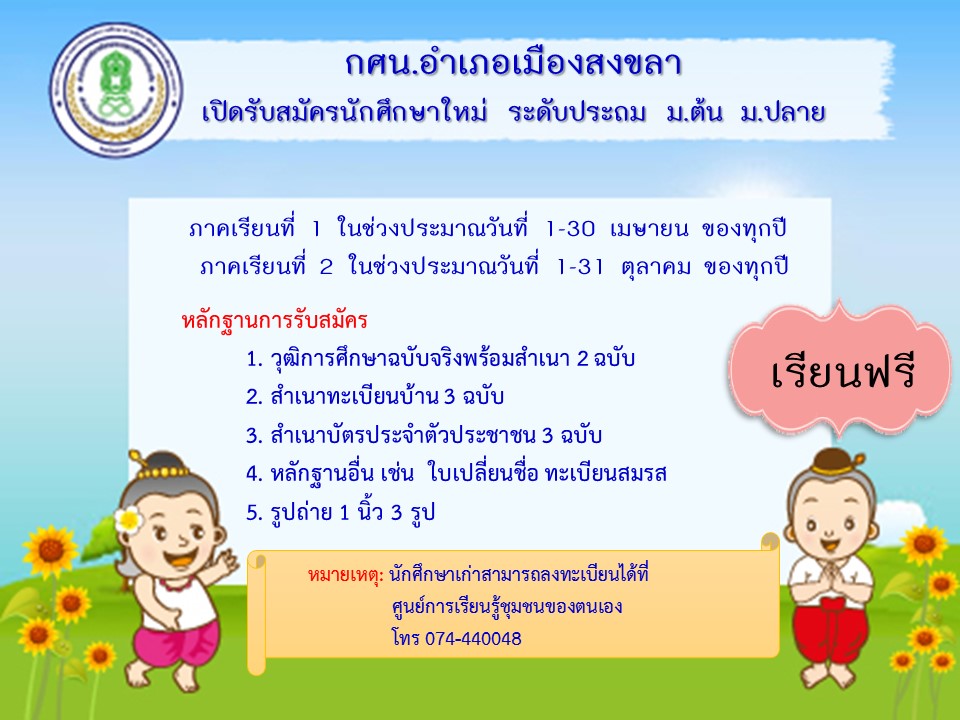 - กศน.ตำบลพะวง รับสมัครที่ อาคารศรีเกียรติพัฒน์ อบจ.สงขลา (ศูนย์ฝึกอาชีพชุมชนตำบลพะวง)
