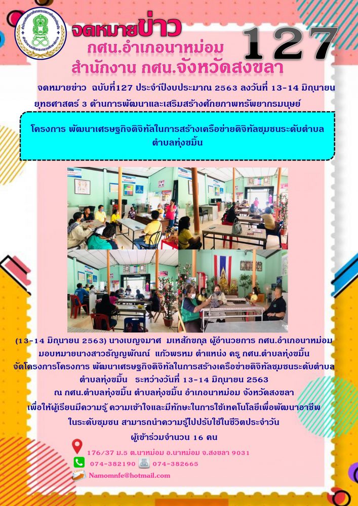 (13-14 มิถุนายน 2563) นางเบญจมาศ มเหสักขกุล ผู้อำนวยการ กศน.อำเภอนาหม่อม มอบหมายนางสาวธัญญพัณณ์ แก้วพรหม ตำแหน่ง ครู กศน.ตำบลทุ่งขมิ้น จัดโครงการโครงการ พัฒนาเศรษฐกิจดิจิทัลในการสร้างเครือข่ายดิจิทัลชุมชนระดับตำบล ตำบลทุ่งขมิ้น ระหว่างวันที่ 13-14 มิถุนายน 2563 ณ กศน.ตำบลทุ่งขมิ้น ตำบลทุ่งขมิ้น อำเภอนาหม่อม จังหวัดสงขลา เพื่อให้ผู้เรียนความรู้ ความเข้าใจและมีทักษะในการใช้เทคโนโลยีเพื่อพัฒนาอาชีพในระดับชุมชน สามารถนำความรู้ไปปรับใช้ในชีวิตประจำวัน ผู้เข้าร่วมจำนวน 16 คน