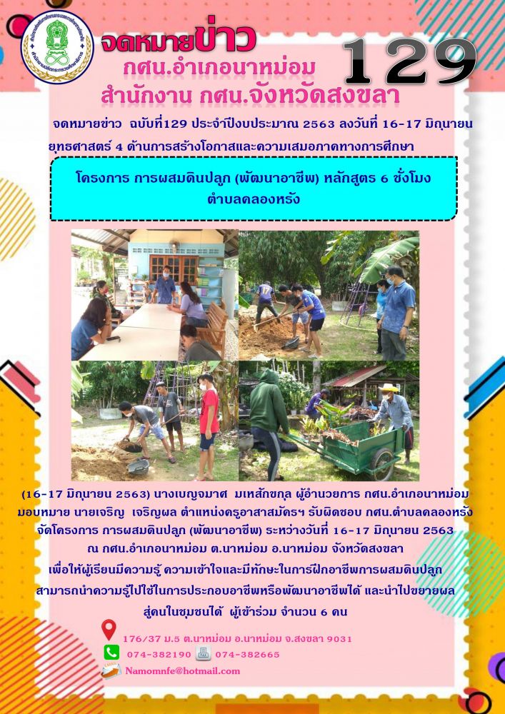 กศน.อำเภอนาหม่อม มอบหมาย นายเจริญ เจริญผล ตำแหน่งครูอาสาสมัครฯ รับผิดชอบ กศน.ตำบลคลองหรังจัดโครงการ การผสมดินปลูก (พัฒนาอาชีพ) ระหว่างวันที่ 16-17 มิถุนายน 2563 ณ กศน.อำเภอนาหม่อม ต.นาหม่อม อ.นาหม่อม จังหวัดสงขลา เพื่อให้ผู้เรียนมีความรู้ ความเข้าใจและมีทักษะในการฝึกอาชีพการผสมดินปลูก สามารถนำความรู้ไปใช้ในการประกอบอาชีพหรือพัฒนาอาชีพได้ และ นำไปขยายผลสู่คนในชุมชนได้ ผู้เข้าร่วม จำนวน 6 คนจัดโครงการ การผสมดินปลูก (พัฒนาอาชีพ) หลักสูตร 6 ชั่งโมง ตำบลคลองหรัง
