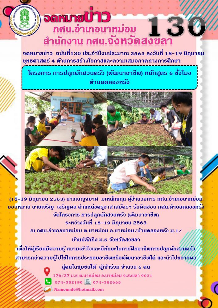 ณ กศน.อำเภอนาหม่อม ต.นาหม่อม อ.นาหม่อม/บ้านคลองหรัง ม.1/บ้านปลักทิง ม.6 จังหวัดสงขลา เพื่อให้ผู้เรียนมีความรู้ ความเข้าใจและมีทักษะในการฝึกอาชีพการปลูกผักสวนครัว