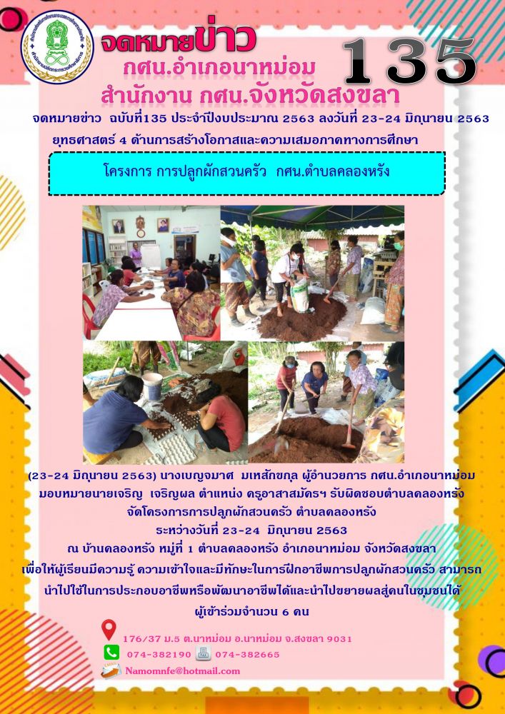 (23-24 มิถุนายน 2563) นางเบญจมาศ มเหสักขกุล ผู้อำนวยการ กศน.อำเภอนาหม่อม มอบหมายนายเจริญ เจริญผล ตำแหน่ง ครูอาสาสมัครฯ รับผิดชอบตำบลคลองหรังจัดโครงการการปลูกผักสวนครัว