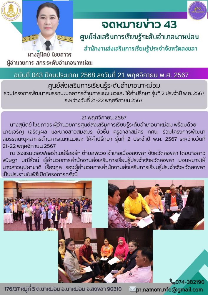 นางสุนิตย์ ไชยถาวร ผู้อำนวยการศูนย์ส่งเสริมการเรียนรู้ระดับอำเภอนาหม่อม พร้อมด้วย นายเจริญ เจริญผล และนางสาวสมสมร บัวชื่น ครูอาสาสมัคร กศน. ร่วมโครงการพัฒนาสมรรถนะบุคลากรด้านการแนะแนวและ ให้คำปรึกษา รุ่นที่ 2 ประจำปี พ.ศ. 2567 ระหว่างวันที่ 21-22 พฤศจิกายน 2567