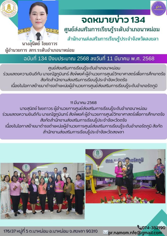 ร่วมแสดงความยินดีกับ นายณัฐภูมินทร์ สังข์พงศ์ ผู้อำนวยการศูนย์วิทยาศาสตร์เพื่อการศึกษาตรัง สังกัดสำนักงานส่งเสริมการเรียนรู้ประจำจังหวัดตรัง เนื่องในโอกาสย้ายมาดำรงตำแหน่งผู้อำนวยการศูนย์ส่งเสริมการเรียนรู้ระดับอำเภอรัตภูมิ สังกัดสำนักงานส่งเสริมการเรียนรู้ประจำจังหวัดสงขลา