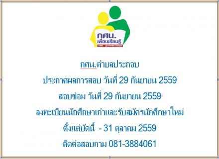กศนตำบลประกอบ ประกาศผลการสอบปลายภาค 1/2559 วันที่ 29 กันยายน 2559 และทำการสอบซ่อมในวันที่ 29 กันยายน 2559 ตั้งแต่เวลา 08.30 - 12.00 น. สำหรับนักศึกษาเก่าสามารถลงทะเบียนเรียนในวันที่ 29 กันยายน 2559 เป็นต้นไป