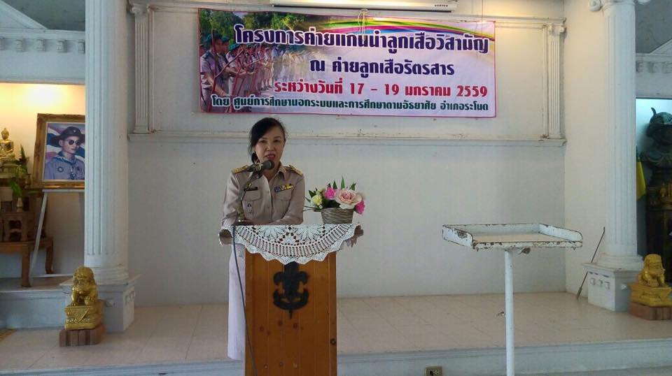 พิธีเปิดโครงการค่ายแกนนำลูกเสือวิสามัญ โดยนางวรรญา ทิพย์ดนตรี ผู้อำนวยการสำนักงาน กศน.จังหวัดสงขลา ให้เกียรติเป็นประธานในพิธีเปิดค่ายของ กศน.อำเภอระโนด นำโดยนายไพโจรน์ คเชนทองสุวรรณ์ ผู้อำนวยการ กศน.อำเภอระโนด และคณะครูกศน.อำเภอระโนด