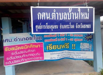 นายไพโรจน์ คเชนทองสุวรรณ์ ผอ. กศน.อำเภอระโนด มอบหมายให้ นางสาวระเบียบ พรหมบริรักษ์ ครูอาสา เจ้าของพื้นที่ กศน.ตำบลบ้านใหม่ ประชาสัมพันธ์รับสมัครนักศึกษา กศน. ในภาคเรียนใหม่ ณ กศน.ตำบลบ้านใหม่ วันที่ 5 ตุลาคม 2558
