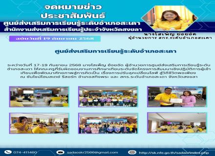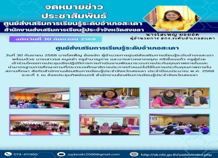 วันที่ 30 กันยายน 2568 นางโสเพ็ญ ย้อยอัด ผู้อำนวยการศูนย์ส่งเสริมการเรียนรู้ระดับอำเภอสะเดา พร้อมด้วย นางเสาวรส หนูหยำ ครูชำนาญการ และนางสาวหยาดอรุณ ศรีเขื่อนแก้ว ครูผู้ช่วย เข้าร่วมโครงการประชุมเชิงปฏิบัติการการดำเนินงานพัฒนาระบบการประกันคุณภาพภายในและ   เข้าชม :  [0]