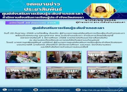 วันที่ 20 กันยายน 2568 นางโสเพ็ญ ย้อยอัด ผู้อำนวยการศูนย์ส่งเสริมการเรียนรู้ระดับอำเภอสะเดาพร้อมด้วยคณะครู และบุคลากร สกร.ระดับอำเภอสะเดา ดำเนินการวัดผลสัมฤทธิ์ ปลายภาคเรียนที่ 1 ปีการศึกษา 2568 รายวิชาบังคับและวิชาเลือกบังคับ ณ สนามสอบโรงเรียนสะเดาขรรค์  เข้าชม :  [0]