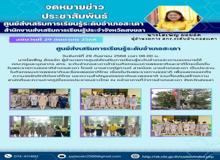 วันจันทร์ที่ 29 กันยายน 2568 เวลา 08.00 น. นางโสเพ็ญ ย้อยอัด ผู้อำนวยการศูนย์ส่งเสริมการเรียนรู้ระดับอำเภอสะเดามอบหมายให้ คณะครูและบุคลากร สกร. ระดับอำเภอสะเดาเข้าร่วมกิจกรรมเคารพธงชาติและชาติไทยเนื่องในวันพระราชทานธงชาติอำเภอสะเดา โดยมี นางสาวณัฐกานต์ ส  เข้าชม :  [0]