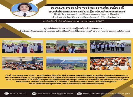 วันที่ 31 กรกฎาคม 2567 นางโสเพ็ญ ย้อยอัด ผู้อำนวยการศูนย์ส่งเสริมการเรียนรู้ระดับอำเภอสะเดา พร้อมด้วยตัวแทน คณะครูบุคลากร นำนักศึกษาเข้าร่วมเดินขบวนพาเหรด เพื่อเป็นเกียรติโครงการกีฬา สกร. ชายแดนใต้เกมส์ โดยมีวัตถุประสงค์เพื่อเสริมสร้างสุขภาพพลานามัยที่ดี