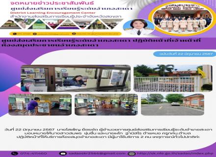 ศูนย์ส่งเสริมการเรียนรู้ระดับอำเภอสะเดา ปฏิบัติหน้าที่เจ้าหน้าที่ ห้องสมุดประชาชนอำเภอสะเดา