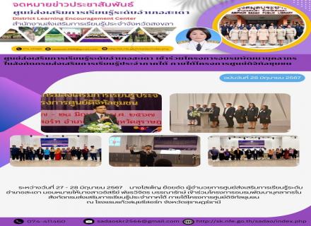 ระหว่างวันที่ 27 - 28 มิถุนายน 2567 นางโสเพ็ญ ย้อยอัด ผู้อำนวยการศูนย์ส่งเสริมการเรียนรู้ระดับอำเภอสะเดา มอบหมายให้นางสาวอิสรีย์ พัชรวิจิตร บรรณารักษ์ เข้าร่วมโครงการอบรมพัฒนาบุคลากรในสังกัดกรมส่งเสริมการเรียนรู้ประจำภาคใต้ ภายใต้โครงการศูนย์ดิจิทัลชุม
