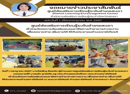 วันที่ 1 กรกฎาคม 2567 นางโสเพ็ญ ย้อยอัด ผู้อำนวยการศูนย์ส่งเสริมการเรียนรู้ระดับอำเภอสะเดา มอบหมายให้ นายผไท ฐานิสโร ครู กศน.ตำบลและนักศึกษา ศกร.ตำบลเขามีเกียรติ เข้าร่วมโครงการส่งเสริมอบรมอาชีพการทำอาหารคาวหวาน เพื่อลดรายจ่าย เพิ่มรายได้ ให้กับประชาชน