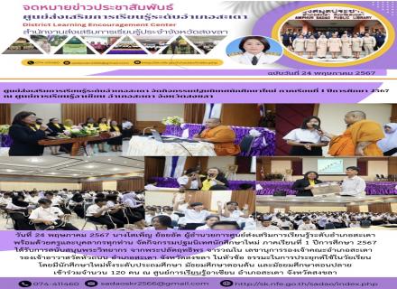 วันที่ 24 พฤษภาคม 2567 นางโสเพ็ญ ย้อยอัด ผู้อำนวยการศูนย์ส่งเสริมการเรียนรู้ระดับอำเภอสะเดา พร้อมด้วยครูและบุคลากรทุกท่าน จัดกิจกรรมปฐมนิเทศนักศึกษาใหม่ ภาคเรียนที่ 1 ปีการศึกษา 2567 ได้รับการสนับสนุนพระวิทยากร จากพระปลัดฤทธิพร จารวณโน เลขานุการรองเจ้าคณะ