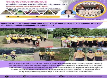 วันที่ 3 มิถุนายน 2567 นางโสเพ็ญ ย้อยอัด ผู้อำนวยการศูนย์ส่งเสริมการเรียนรู้ระดับอำเภอสะเดา มอบหมายให้นางเสาวรส หนูหยำ ครูชำนาญการ พร้อมด้วยบุคลากร ศูนย์ส่งเสริมการเรียนรู้ระดับอำเภอสะเดา เข้าร่วมกิจกรรมจิตอาสาพัฒนา ทำความสะอาดและปรับปรุงภูมิทัศน์ริมคลอ