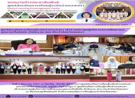 วันที่ 5 มิถุนายน 2567 นางโสเพ็ญ ย้อยอัด ผู้อำนวยการศูนย์ส่งเสริมการเรียนรู้ระดับอำเภอสะเดา มอบหมายให้นางเสาวรส หนูหยำ ครูชำนาญการ ศูนย์ส่งเสริมการเรียนรู้ระดับอำเภอสะเดา เข้าร่วมประชุมผู้บริหารสถานศึกษาและบุคลากรในสังกัด