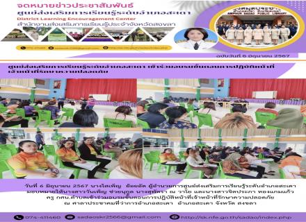 วันที่ 6 มิถุนายน 2567 นางโสเพ็ญ ย้อยอัด ผู้อำนวยการศูนย์ส่งเสริมการเรียนรู้ระดับอำเภอสะเดา มอบหมายให้นางสาววันเพ็ญ ช่วยนุกูล นางสุพัตรา ณ วาโย และนางสาวจิตประภา ทองแกมแก้ว ครู กศน.ตำบลเข้าร่วมอบรมขั้นตอนการปฎิบัติหน้าที่เจ้าหน้าที่รักษาความปลอดภัย ณ ศา