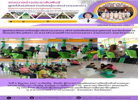 วันที่ 7 มิถุนายน 2567 นางโสเพ็ญ ย้อยอัด ผู้อำนวยการศูนย์ส่งเสริมการเรียนรู้ระดับอำเภอสะเดา มอบหมายให้นางเสาวรส หนูหยำ ครูชำนาญการ พร้อมด้วยนางจารุภัทร โพธิวงษ ครูอาสาสมัคร กศน. ,นางรอชีด๊ะ หีมล๊ะ ครู กศน.ตำบล ,นายรักอรัญ คงนวลใย ครู กศน.ตำบล และตัวแ