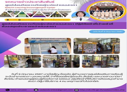 วันที่ 9 มิถุนายน 2567 นางโสเพ็ญ ย้อยอัด ผู้อำนวยการศูนย์ส่งเสริมการเรียนรู้ระดับอำเภอสะเดา มอบหมายให้ ว่าที่ร้อยตรีหญิงเจนใจ สังข์สม และนางสาวมานิตา สังข์สม ตำแหน่งครูผู้สอนผู้ด้อยโอกาส (เร่ร่อน) ปฏิบัติหน้าที่ให้บริการห้องสมุดอำเภอสะเดา มีผู้มาใช้บริการ