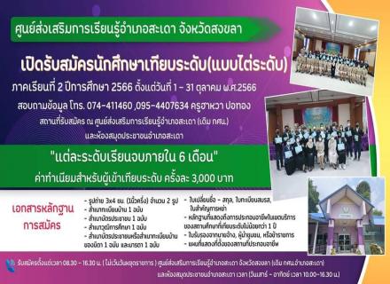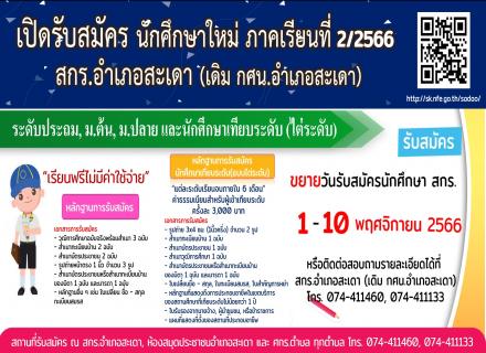 ข่าวดีผู้ที่สนใจสมัครเรียนกับศูนย์ส่งเสริมการเรียนรู้อำเภอสะเดา ทาง สกร.อำเภอสะเดา (เดิม กศน.อำเภอสะเดา) ได้ขยายการเปิดรับสมัครนักศึกษาใหม่ ภาคเรียนที่ 2 ปีการศึกษา 2566 ตั้งแต่วันที่ 1 - 10 พฤศจิกายน 2566 สอบถามข้อมูลเพิ่มเติมได้ที่ 074-411460, 074-41113