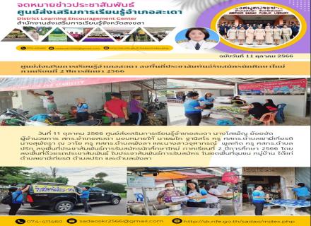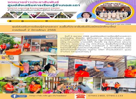 วันที่ 4 ตุลาคม 2566 ศูนย์ส่งเสริมการเรียนรู้อำเภอสะเดา นางโสเพ็ญ ย้อยอัด ผู้อำนวยการ สกร.อำเภอสะเดา มอบหมายให้ นางสาวลักษิมณ คชรัตน์ครูอาสาสมัคร กศน. นางสุพัตรา ณ วาโย นางสาวจุฑาภรณ์ พูลเกิด ครู ศกร.ตำบล และนางสาวณชาฎา ยอดสุวรรณ์ ครูผู้สอนเด็กด้อยโอกา